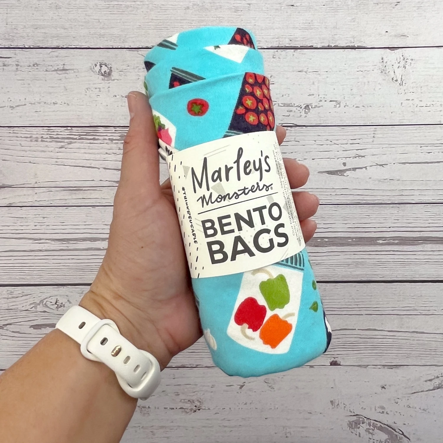 Bento Bags are made with a single layer of 100% cotton flannel and handles that can be tied together to close.