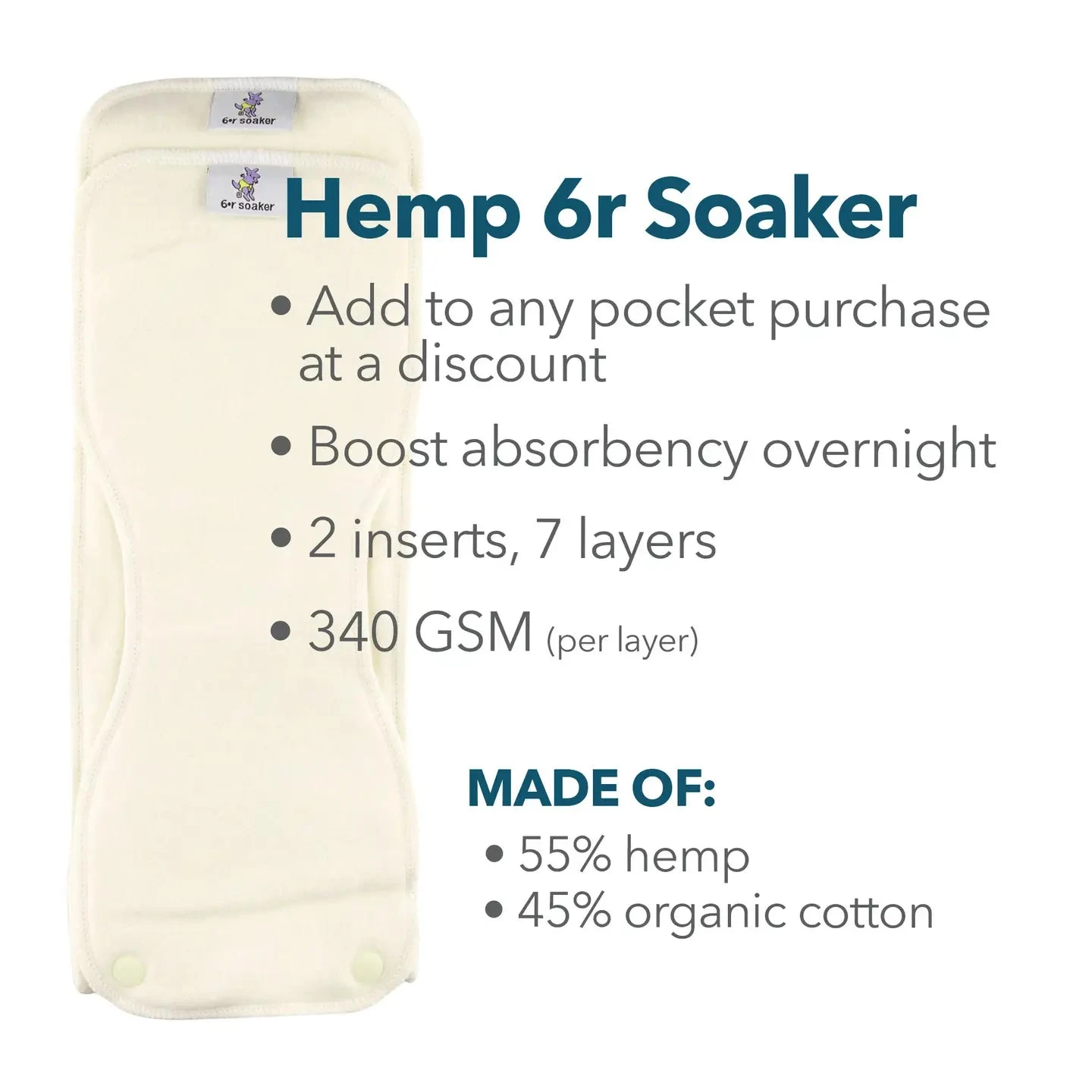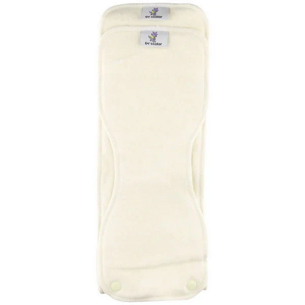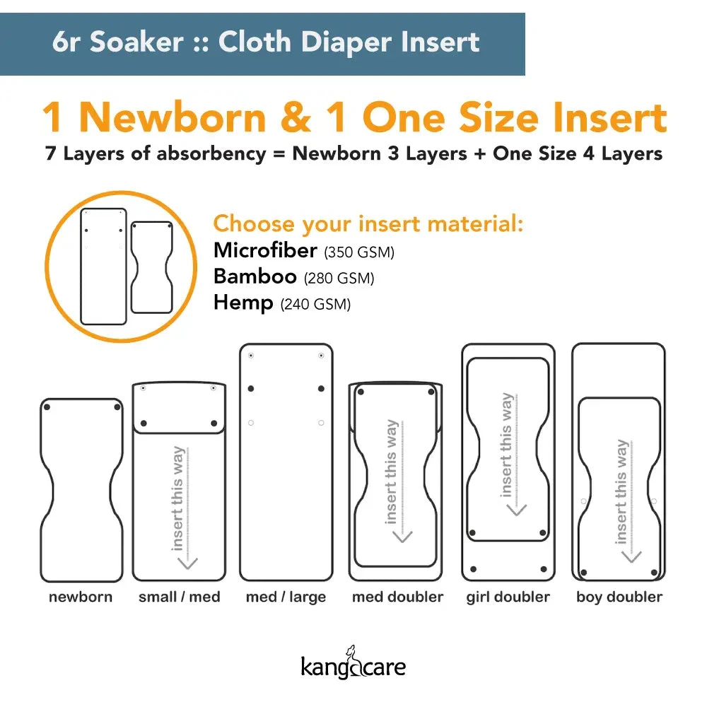 Set yourself up for cloth diapering success with Rumparooz 6r Soaker set inserts! Each set of Rumparooz 6r Soakers includes two inserts – a long, full size insert and a smaller contoured insert – that fit into the pocket of the Rumparooz (or any pocket style diaper). The inserts can be arranged in six different configurations to give maximum adjustability to the absorbency and the fit of the diaper. The Rumparooz 6r Soaker comes in hemp or bamboo. ZERO waste packaging!