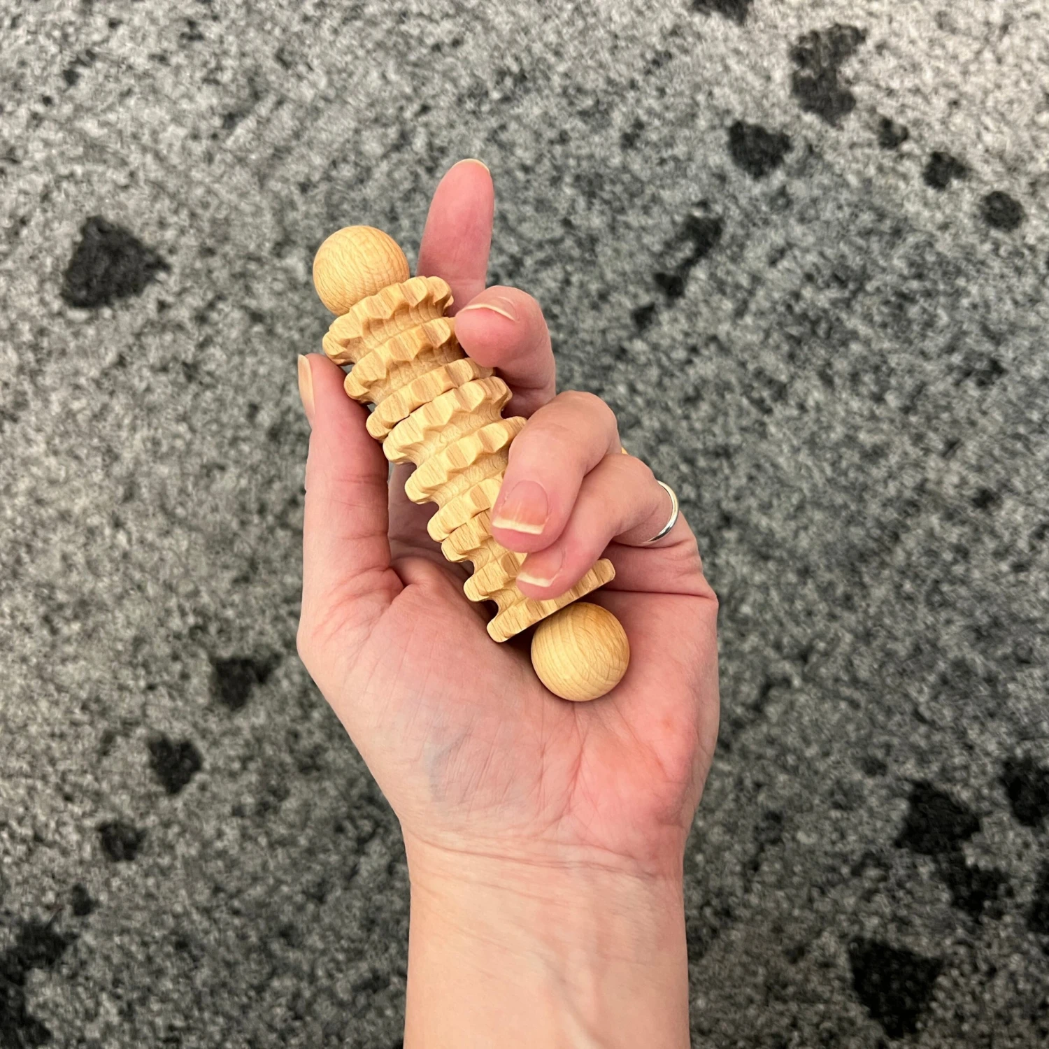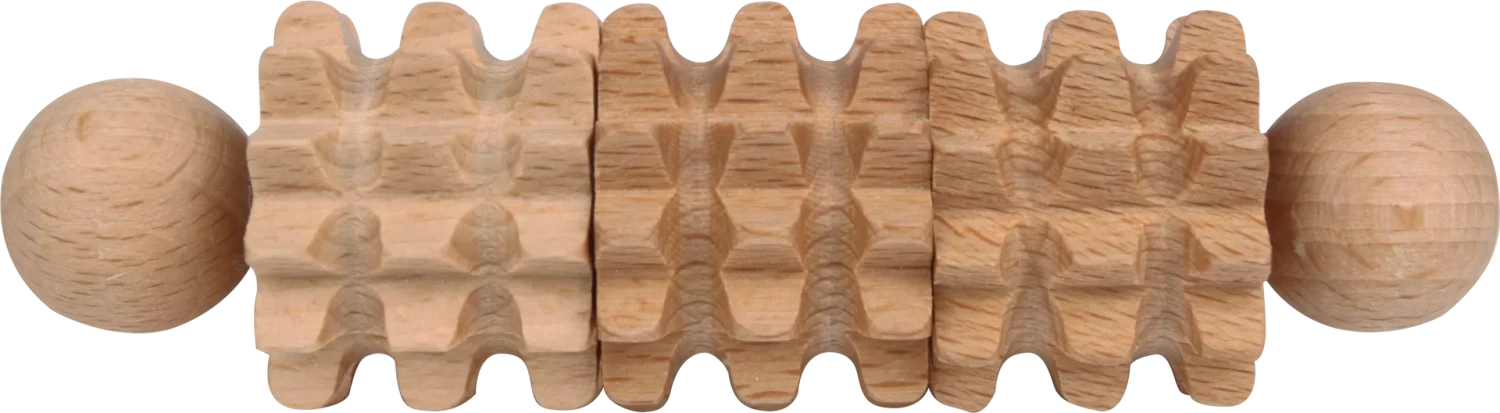 This plastic free oiled Beechwood hand massage roller features three moving rollers and round ends that can provide pressure point therapy in a variety of ways. Measuring roughly 4.33 inches long, this massager is the perfect size to roll along skin with the palm of your hand.