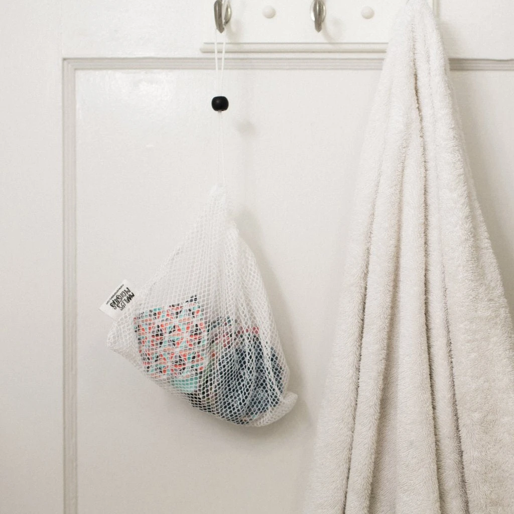 Mesh Laundry Bag: the perfect size to launder small reusables like Facial Rounds, nursing pads, or baby socks. Fill the Mesh Laundry Bag with soiled items, cinch the toggle tight and toss in the wash to help keep things together throughout any laundry routine.