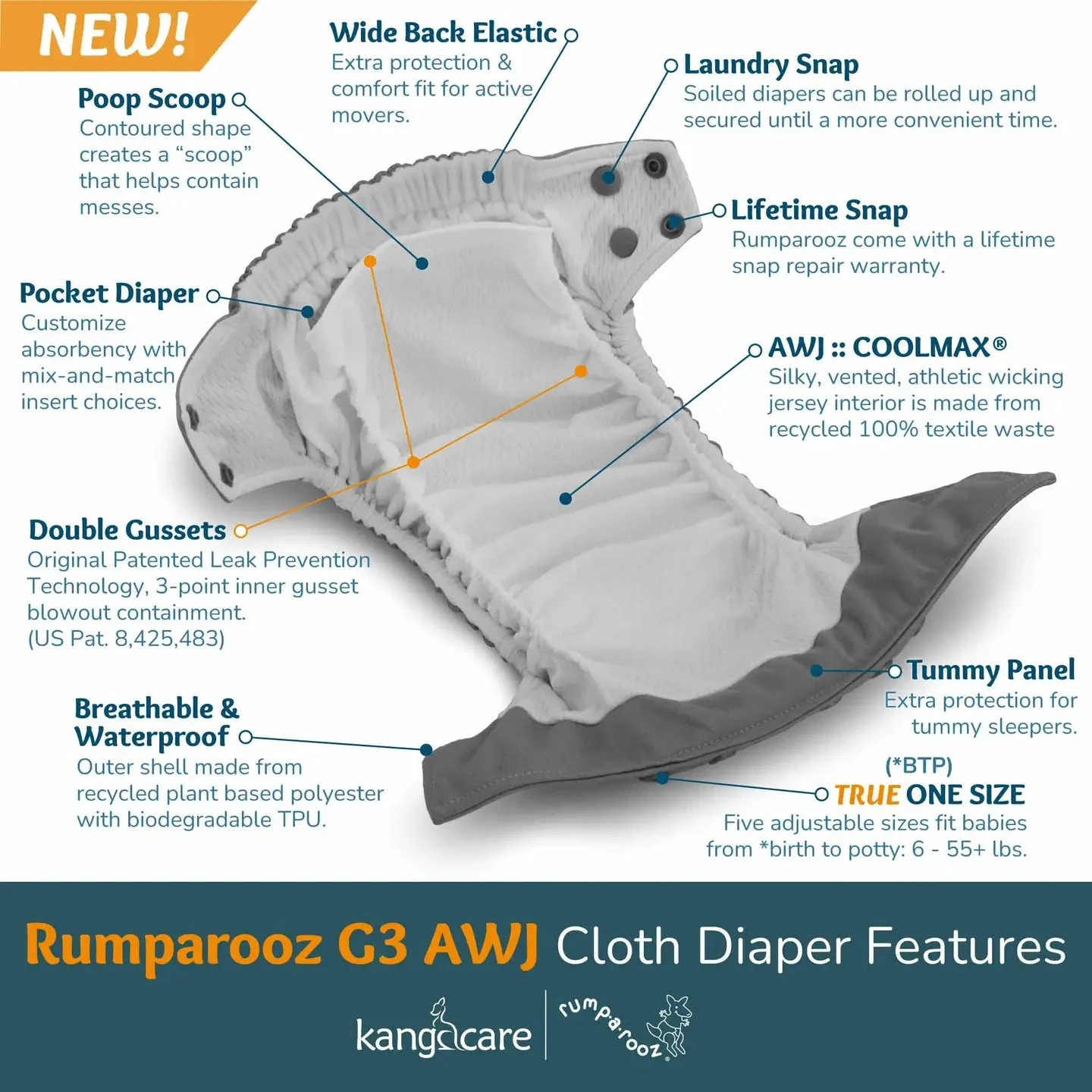 These Rumparooz One Size Pocket Cloth Diapers from Kanga Care have a silky athletic wicking jersey interior made with COOLMAX® EcoMade technology from recycled 100% textile waste for an eco-friendly boost. This advanced fabric enhances breathability and moisture-wicking performance, keeping your baby’s skin dry and comfortable by quickly drawing moisture away, even during active moments. Lightweight and durable, it’s designed to withstand frequent washes while maintaining its softness, making it the perfect inner layer for day or night comfort, and sustainability!