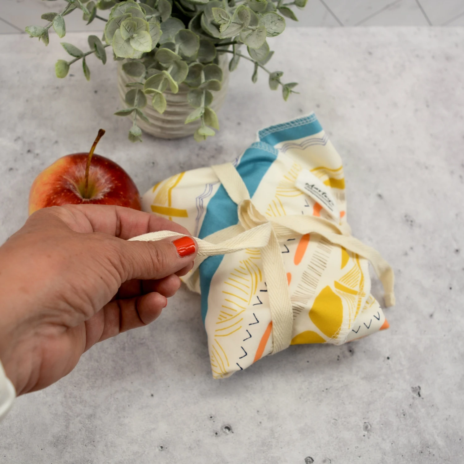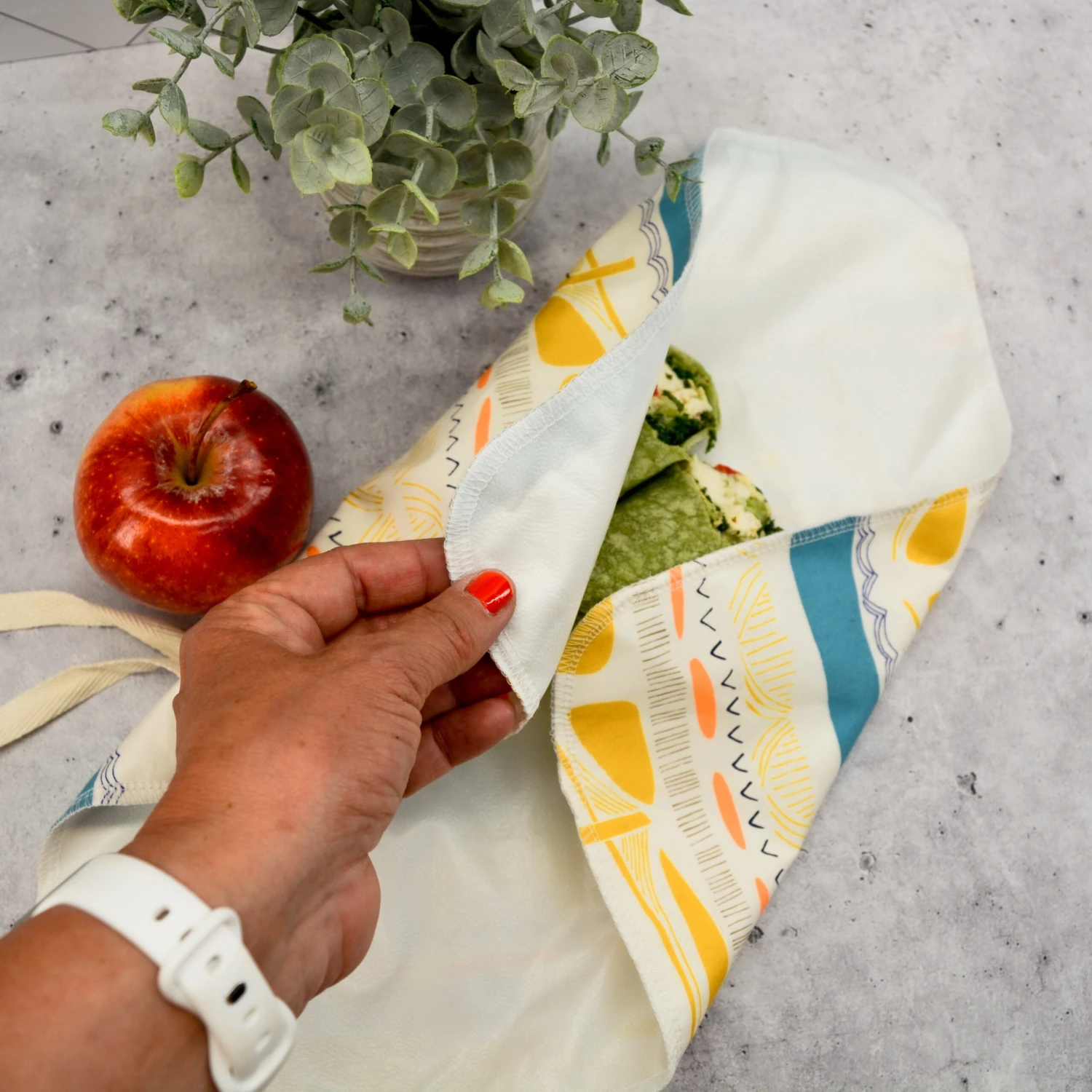 Perfect for taking to work or school! These Sandwich Wraps are constructed with a 100% cotton outer layer and a food grade, waterproof PUL lining. They feature cotton twill cords for wrapping and securing contents. Use these for sandwiches, bagels, burritos, pizza or wrap the bottom of a bouquet for a quick gift!