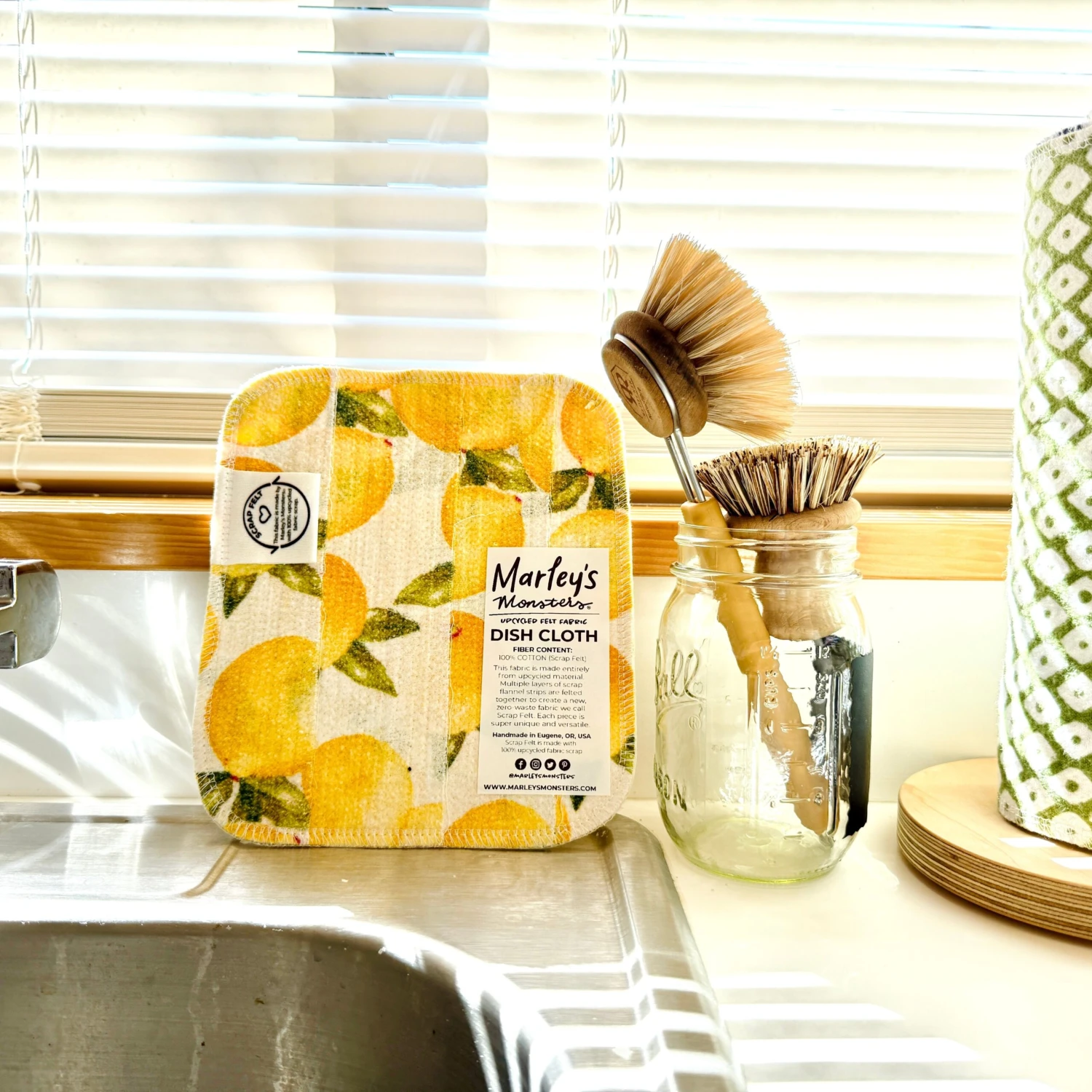 Introducing our new Scrap Felt Dish Cloth! We are always looking for creative ways to reuse our scrap fabric so we felted multiple layers of flannel strips together to create a new, extra absorbent fabric. We then cut and sew this new fabric into Scrap Felt Dish Cloths.