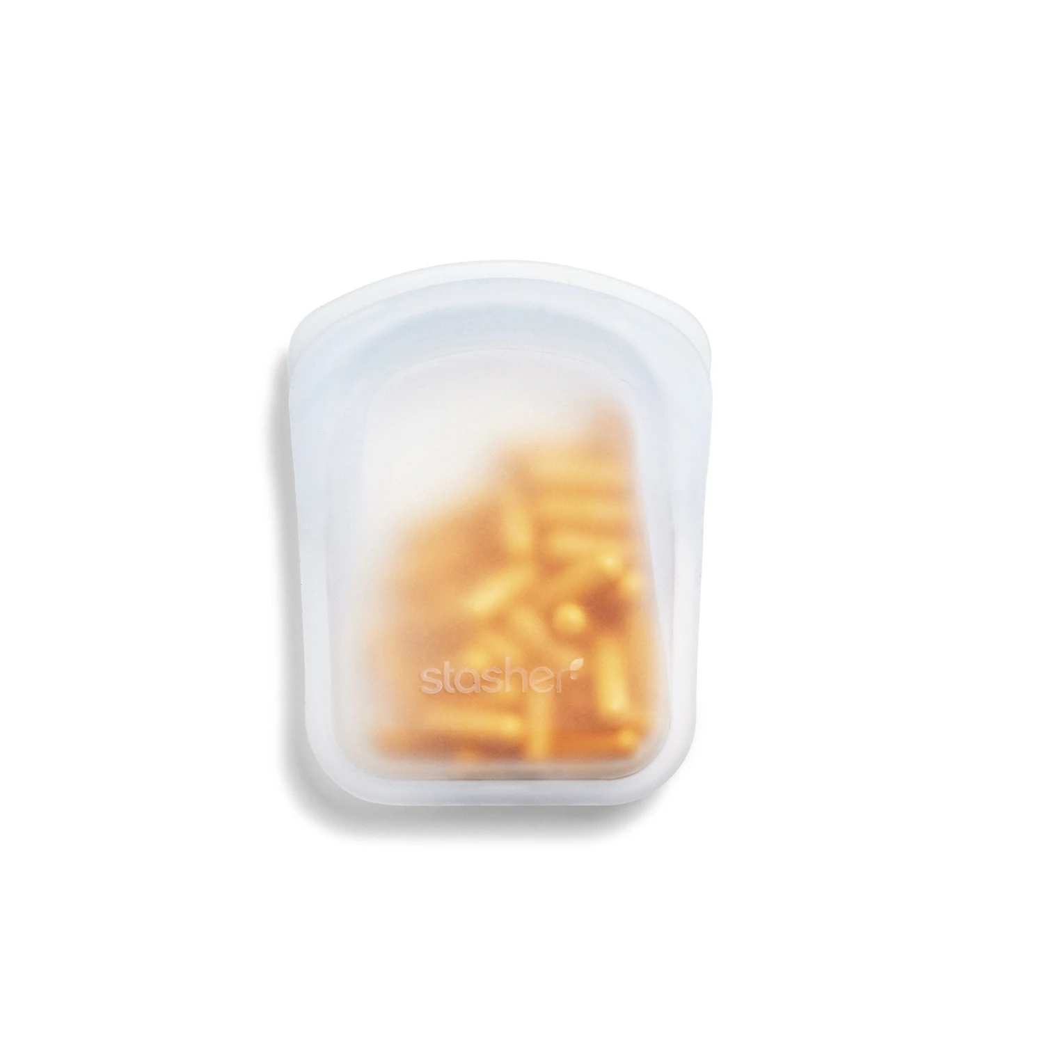 The most discreet and portable Stasher, the Pocket Stasher is ideal for all the daily essentials that fit in the palm of your hand. The patented Pinch-LocTM seal protects personal care products, phone chargers, earbuds, cables, and more. Lightly frosted on both sides for added privacy, the Pocket Stasher is a sustainable and reusable solution for storing and stashing tiny valuables. Comes in a set of 2 with 1 Aqua and 1 Clear.