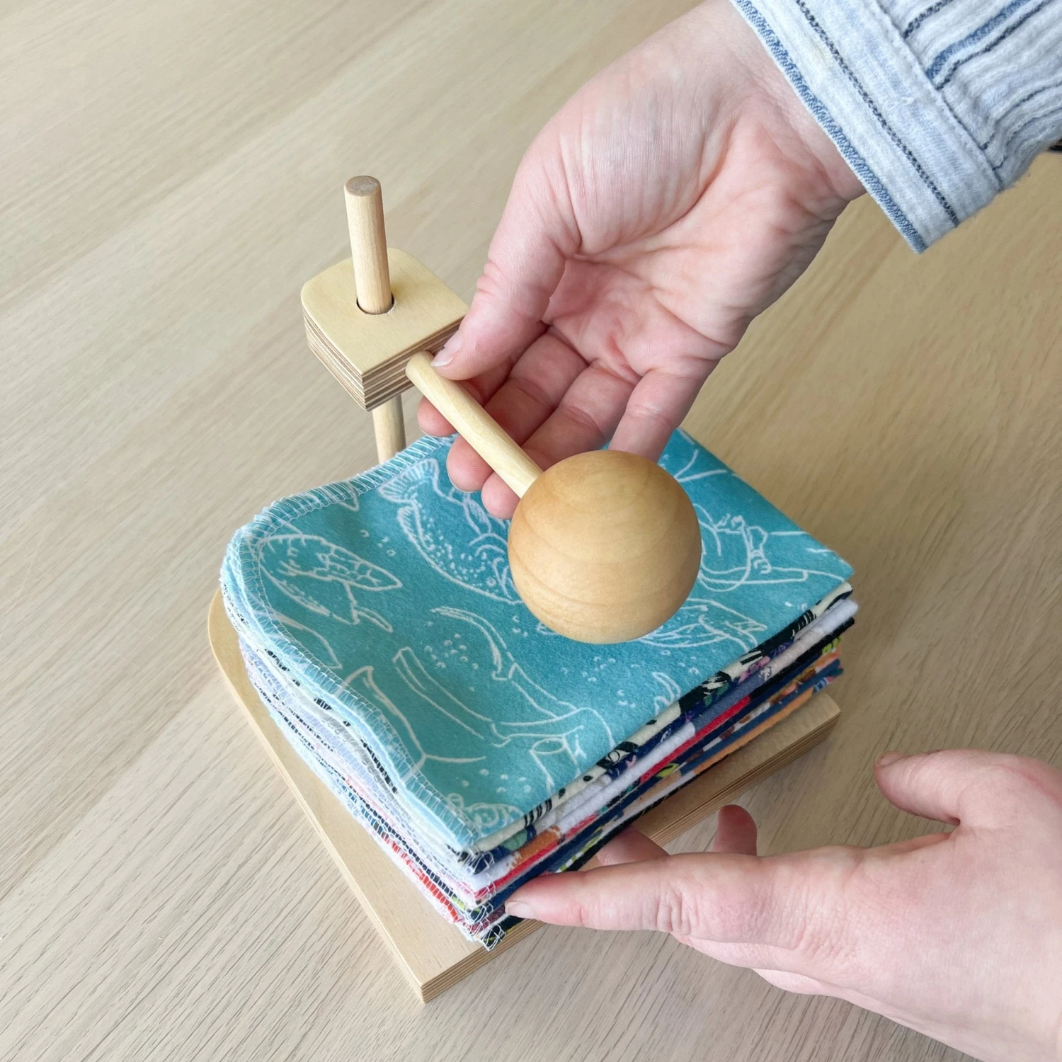 The UNpaper® Caddy features a rounded edge, birch plywood base with a 3/8″ peg that removable hard wood dowel and adhered 100% felted wool counter protector underneath. You can also slide a roll of paper towels over the dowel at anytime. Caddy is finished with a natural tung oil.