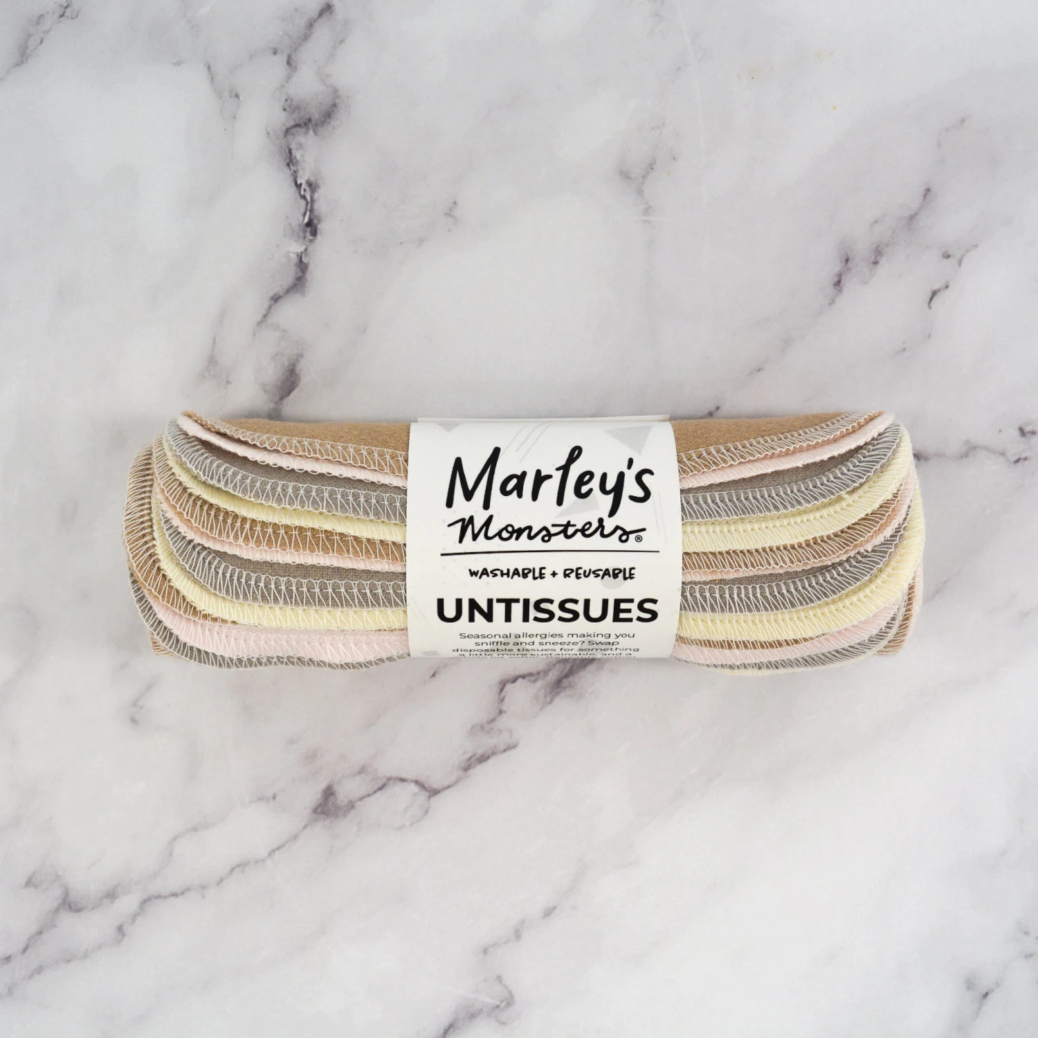 Seasonal allergies making you sniffle and sneeze? Swap disposable tissues for something a little more sustainable, and a whole lot softer. Marley’s Monsters UNtissues® are the perfect eco-friendly solution for runny noses. Reusable cotton UNtissues® are soft on the nose and face and fit perfectly inside the Scrap Felt UNtissue® Holder. Collect the dirty UNtissues in a Wet Bag or Mesh Laundry Bag, wash, and reuse.