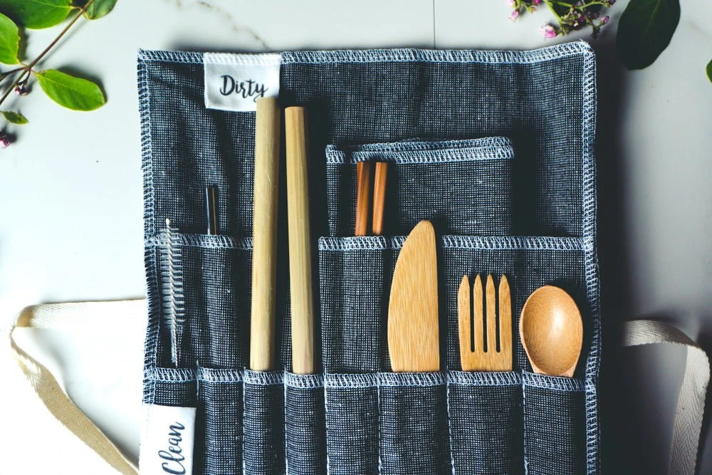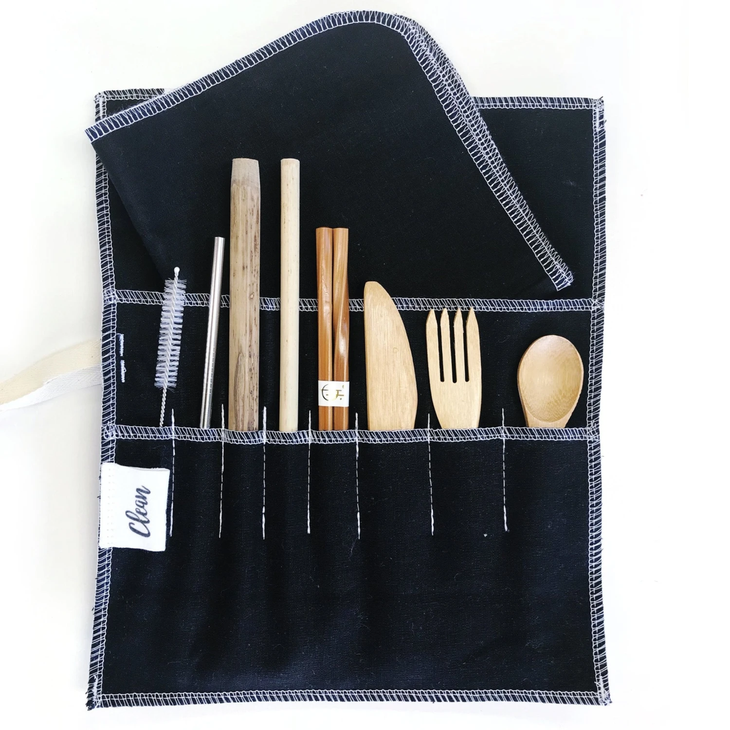 Bring your customized set of utensils with you on the go! Our utensil wrap is the perfect vessel for your personal utensil arsenal. Pack it with makeup brushes, art supplies or reusable silverware and set yourself up to say “no-thank you” to single use items on the daily.